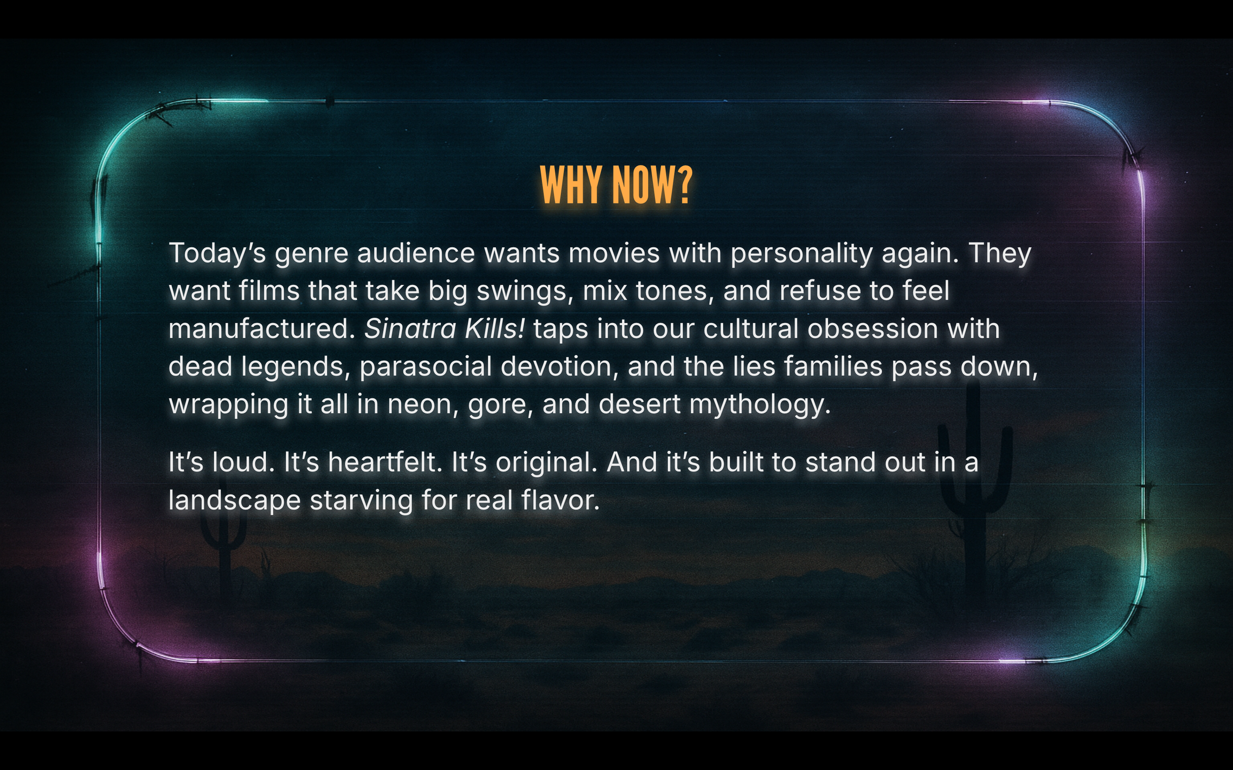 When emotionally-stunted Sam Durango resurrects Frank Sinatra, he and his friends must survive a blood-and-neon-drenched night as the zombie embarks on a brain-eating comeback tour.